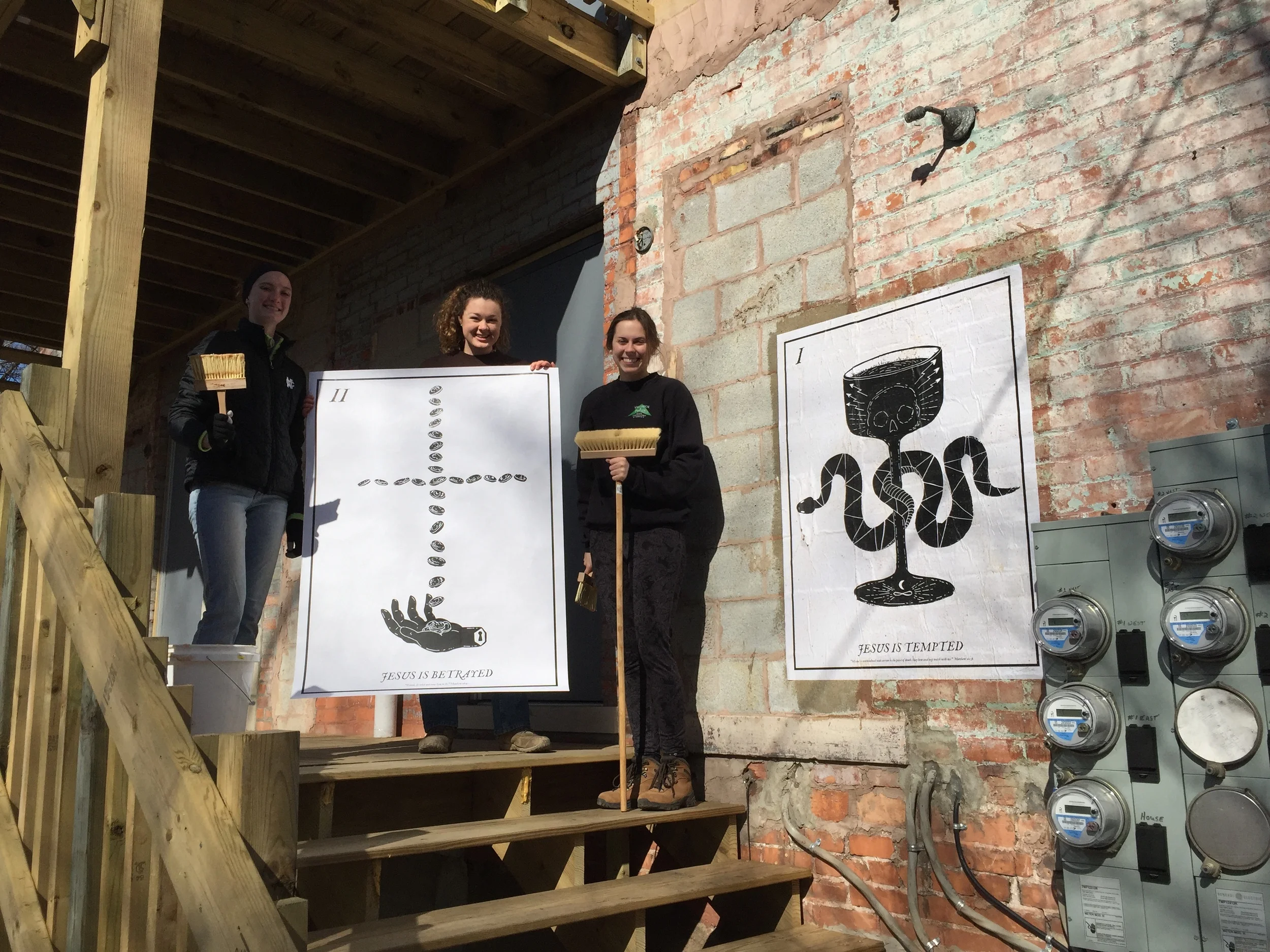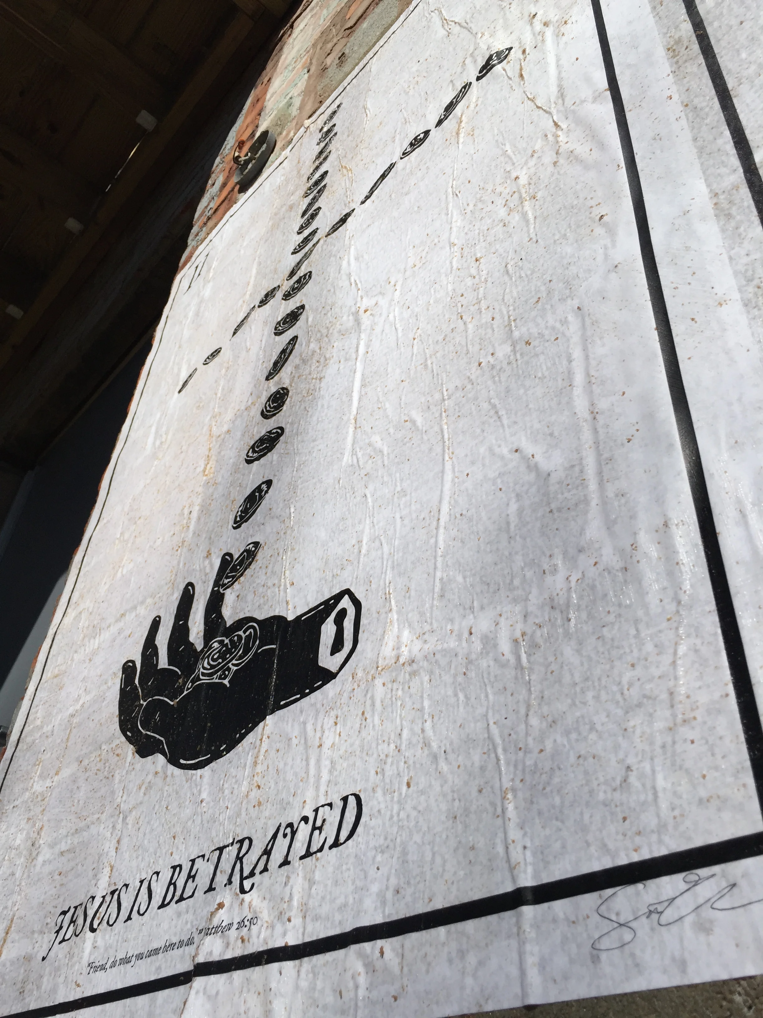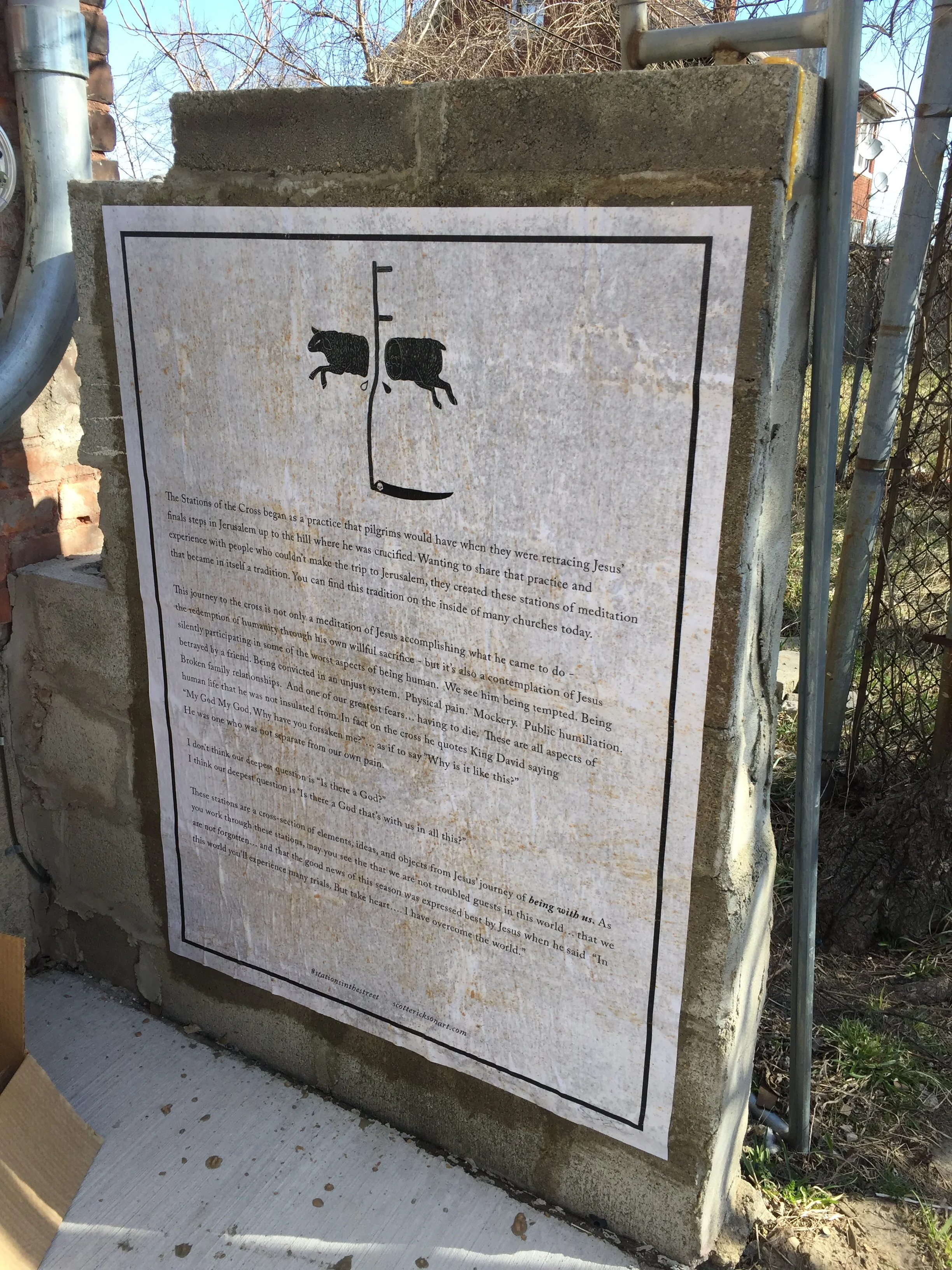 After our practice at the latest Sunday Shindig, friends of #motowesley headed up to the Foundry House to install Scott Erickson's "Stations in the Street" show for Holy Week 2016. This collection of wheat-pasted prints leads viewers through the traditional stations of the cross with new imagery in unique locations around the world.